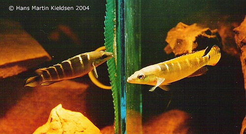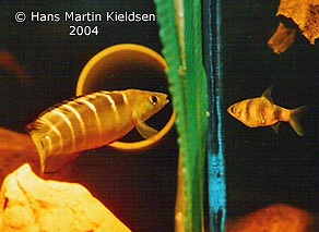 Der er et eller andet med hormoner i vandet (eller hvad det nu er) som muligvis er en vigtig del af legeforberedelserne. Dette vanskelige område er slet ikke undersøgt til bunds af videnskaben, men det er anerkendt akvaristlommefilosofi at disse stoffer spiller en rolle. Det endte i hvert fald med at jeg fulgte hans råd og delte et 90-liter akvarium på midten med et stift, finmasket plasticnet. Akvariet var indrettet ret enkelt for at efterligne fiskenes naturlige biotop: et par store, flade sten hvorunder der kunne graves huler, en enkelt trærod og fint, gravevenligt grus. Planter var der ingen af og en rimelig kraftig cirkulationspumpe - 800 L/t - skabte en del strøm og filtrerede samtidig vandet gennem en almindelig blå filtersvamp. Temperaturen eksperimenterede jeg en del med, men syntes ikke det virkede særligt humørbefordrende for parret når temperaturen kom op i nærheden af de 30°, så jeg endte ved ca. 27° (med svag natsænkning) og det har siden virket tilfredsstillende.