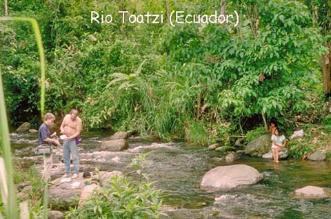 Vi fra Danmark tog fra Kastrup lufthavn den 3. februar kl. 9.10 til Paris og her mødte vi de øvrige nordiske deltagere. Kl. 12.30 gik vi om bord på det Colombianske fly Avianca 747 og efter 11 timer over Atlanten, landede vi i Colombias hovedstad, Bogota. Her skiftede vi til et andet fly til Quito i Ecuador og efter her at have fået udleveret al vor bagage og fået vekslet penge, tog vi et par taxies ind til hotellet. Klokken var nu blevet 21.00 lokal tid, og vi havde rejst i ca. et døgn, så vi gik hurtigt i seng til en tiltrængt søvn. Efter morgenmaden næste dag tog vi ud for at hente de 2 biler, som var bestilt hjemmefra og kørte tilbage til hotellet for at hente vor bagage. Så satte vi kursen sydover til et sted, som hedder Aloag afstanden hertil var ca. 22 km. Her drejede vi af og kørte vestover i retning mod Santa Domingo De Dos Colorados. Efter ca. 72 km gør vi holdt ved en flod ved navn Rio Toachi. Alf Stalsberg beslutter sig til at hoppe i vandet for at se, hvad der er af fisk han fanger da også hurtigt nogle Aequidens rivulatus, alt imedens jeg farter rundt på jagt efter nogle fantastisk flotte sommerfugle, og det lykkes da også at indfange nogle forskellige typer med kameraet.