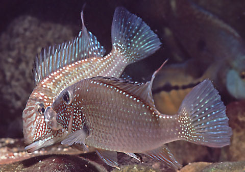 Det er både hannen og hunnen, der passer æggene, man kan se dem skiftes til at stå og vifte henover æggene, men de er ikke særlig vagtsomme som andre cichlider, der ofte er meget aggressive, når de har æg. Her skal lige nævnes, at jeg har set andre fisk få lov til at gå hen og æde løs af æggene, alt imens Satanoperca jurupari stille stod og så på det.