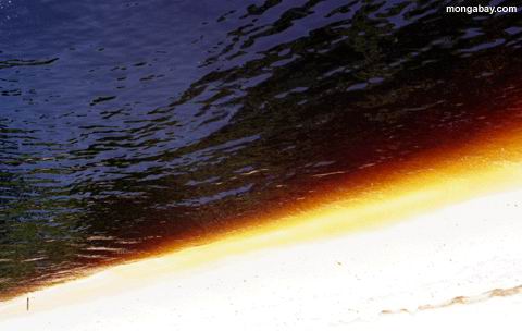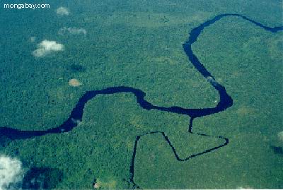 Ovenstående billede er af Rio Negro der slanger sig igennem regnskovens meget frodige natur. På nedenstående billede kan man se hvorfor det kaldes sortvand: