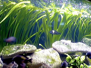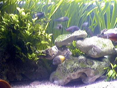 Temperaturen i Tanganyikasøen ligger mellem 23-28º. Jeg har fundet ud af at mine fisk yngler bedst ved 25,5º hvilket er den temp. jeg tilstræber i alle mine akvarier. Vandet i søen er hårdt, det svarer faktisk til vores ledningsvand, med en Ph. på mellem 8.6-9.2 hvilket betyder, mere rent vand noget mere syntes fiskene at trives. For mit eget vedkommende så skifter jeg ca. 50% en gang om ugen, det er meget vand hvis man f. eks har et 530L. akvarium. På samme tid fjerner jeg blade i overfladen for at sikre en bedre cirkulation. Se sidste billede, her kan man se at bladene er fjernet. Men der sker det, at vandet efter kort tid bliver fyldt af mikroorganismer, planterester, og affaldsstoffer, hvilket sænker ph. værdien (Gør vandet blødt). Det er også for at prøve at holde på hårdheden at jeg har valgt at bruge kalksten i mine akvarier. Tropheus'en er meget ilt krævende, derfor er det vigtigt at have en god cirkulation i akvariet. Jeg plejer at sige som grundregel, at har man Tropheus skal vandet skiftes (Med Pumpen) Ca. 4 gange i timen, det vil sige at har du f.eks. et 325L. akvarium skal din pumpe faktisk Yde 1300 Liter i timen.