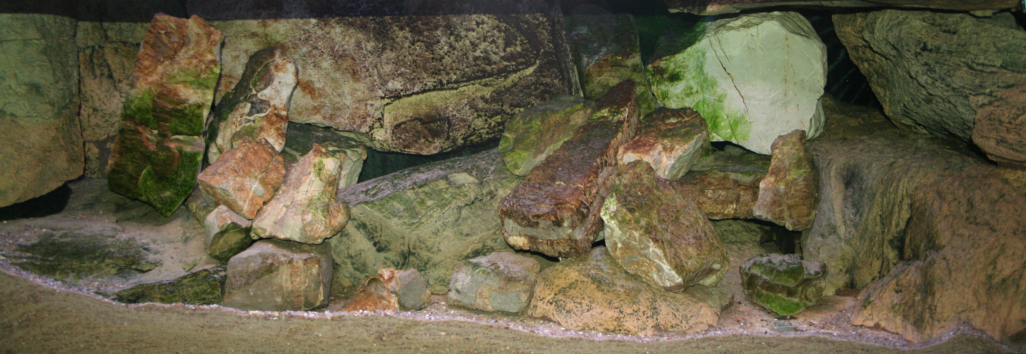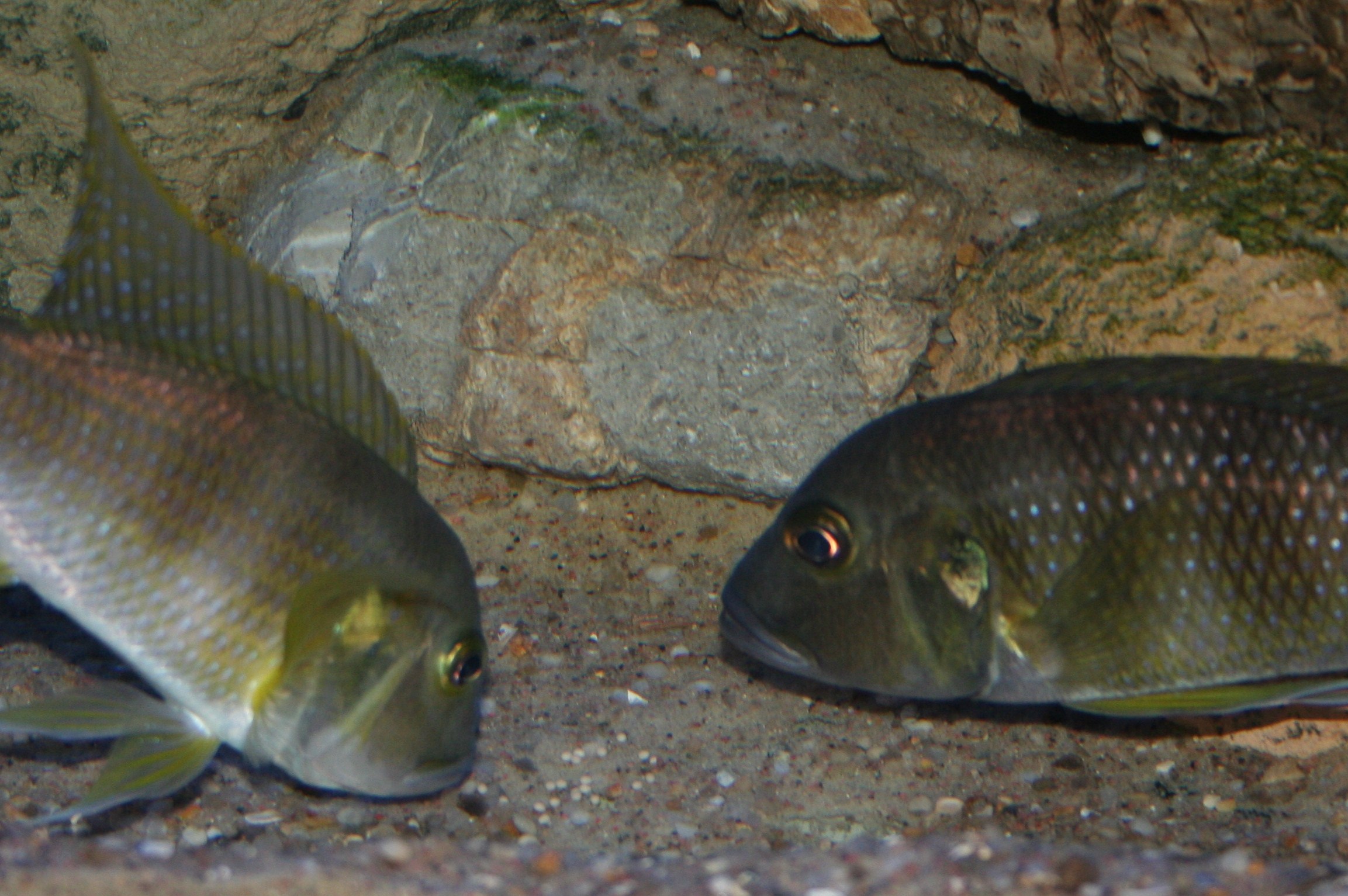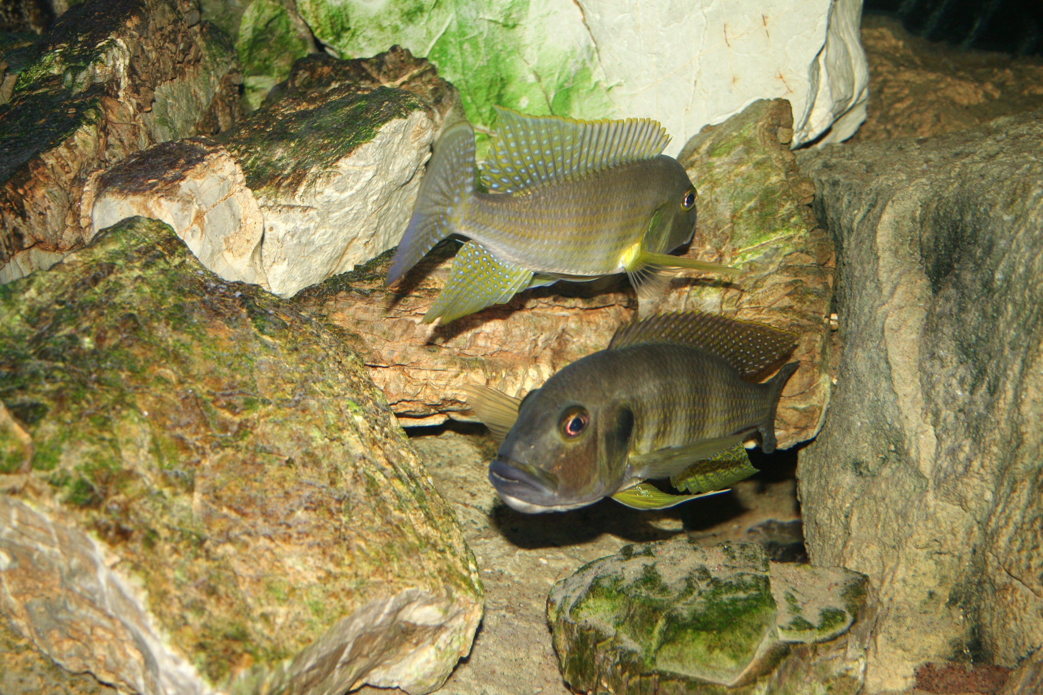 I den bageste del af akvariet har jeg bygget to store huler, med større og mindre klippestykker. Hulerne er fyldt med sand og grus, men disse huler synes ikke at virke tiltrækkende på parret overhovedet.