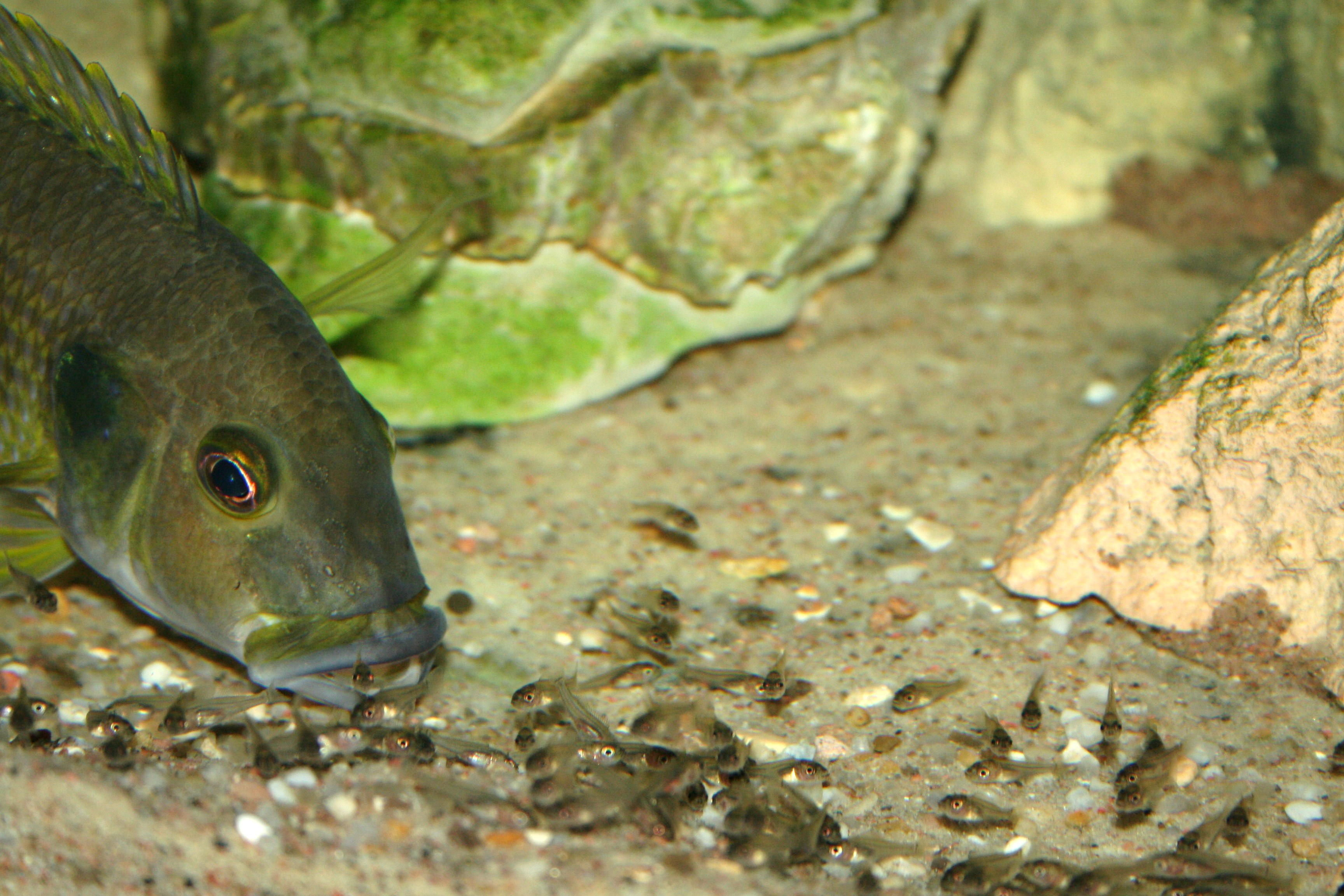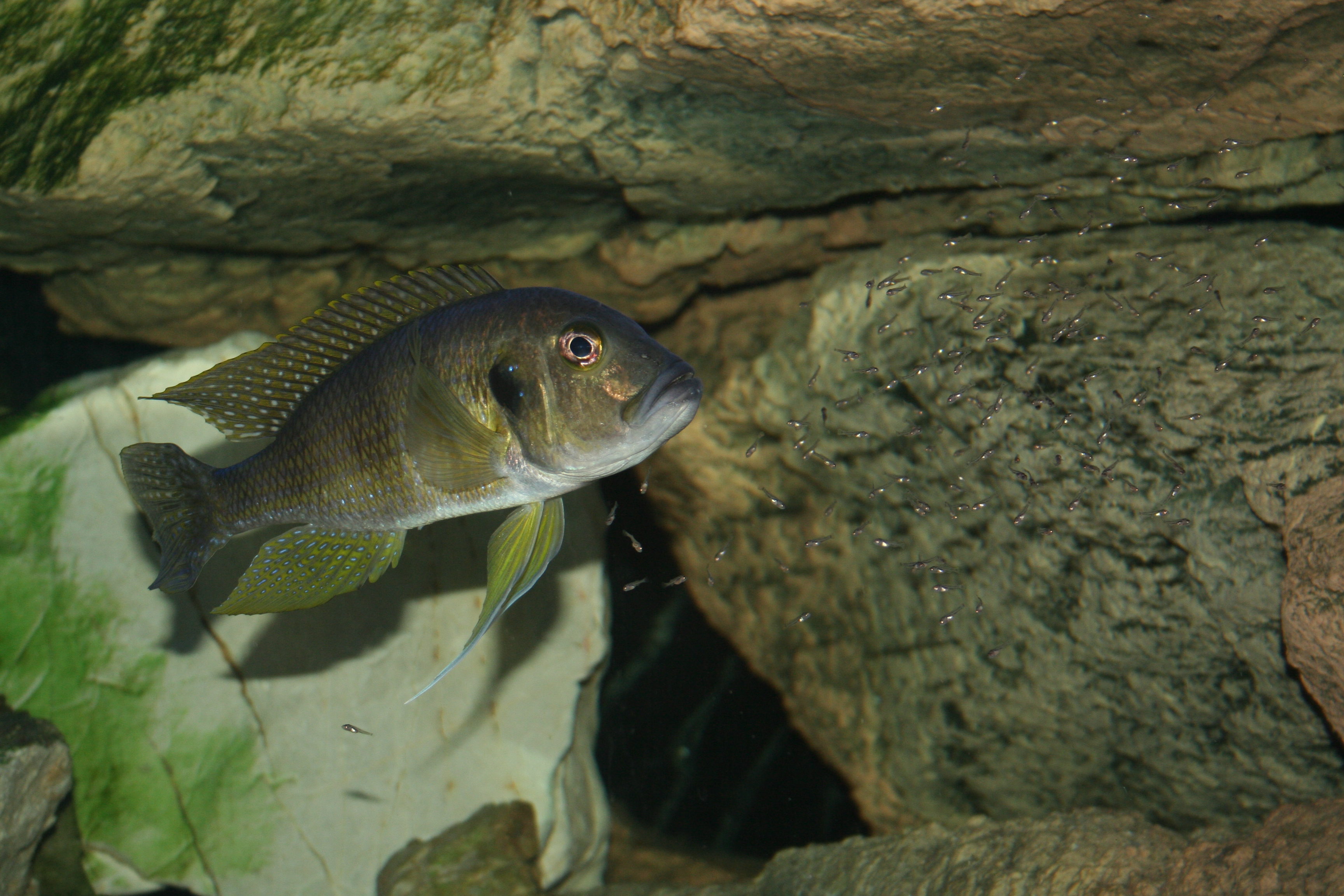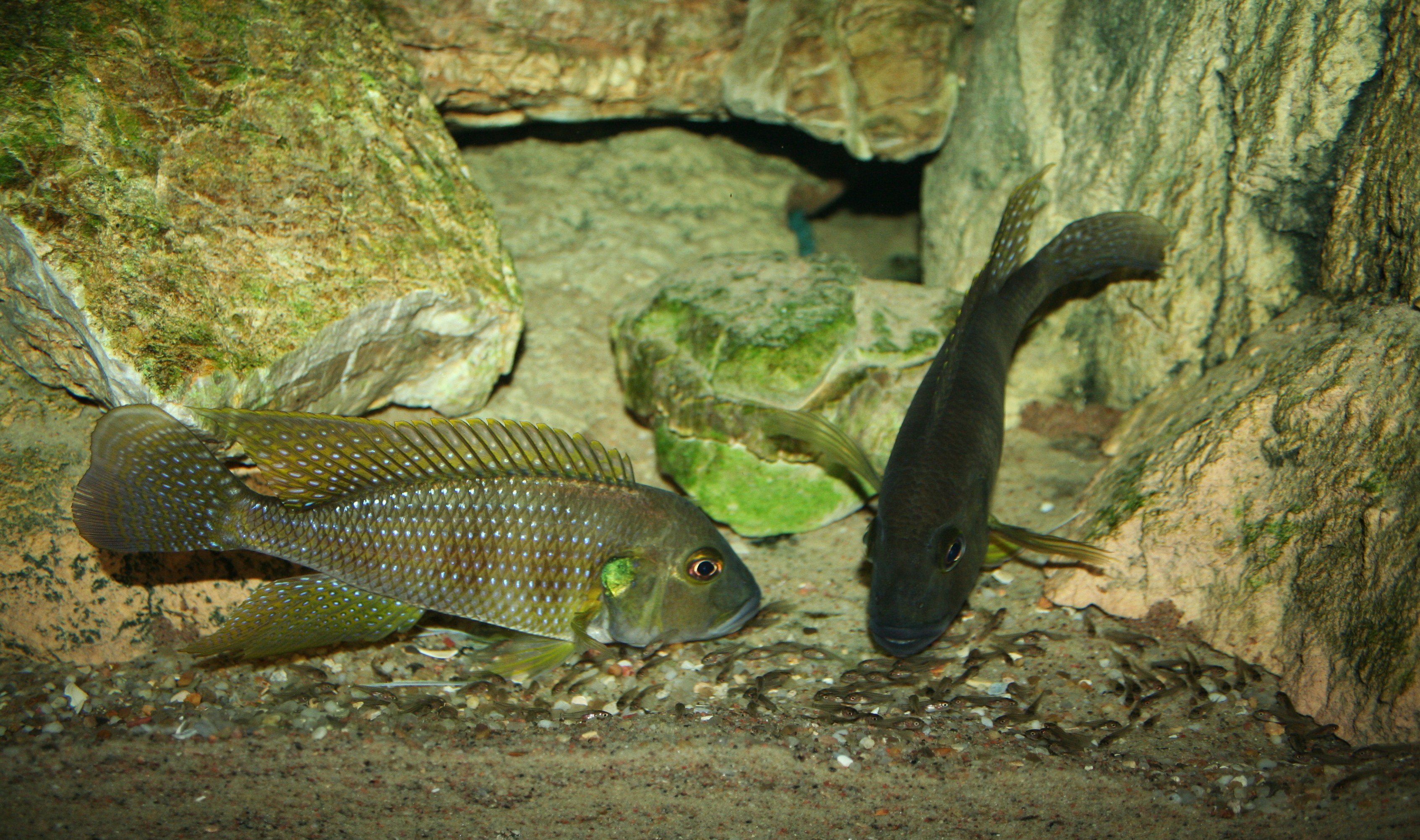 Ovenstående billede er taget om morgenen lige efter lyset tændes. Det er svært at forestille sig, at der lever mere end 200 fisk i dette akvarium. Efter 5 - 20 minutter kommer forældrene ud af hulerne med ungerne i munden. Når ungerne spyttes, går de direkte til bunden. Herefter spreder de sig stille og roligt ud over hele akvariet.