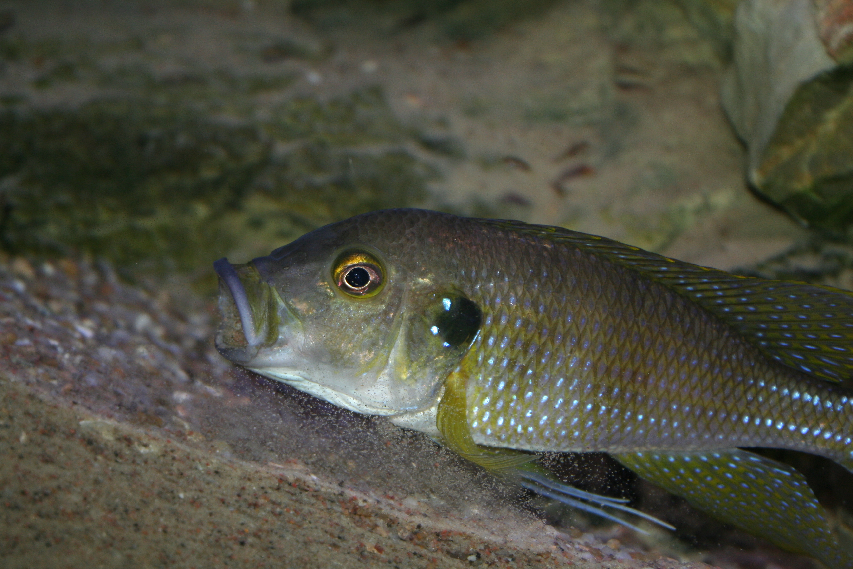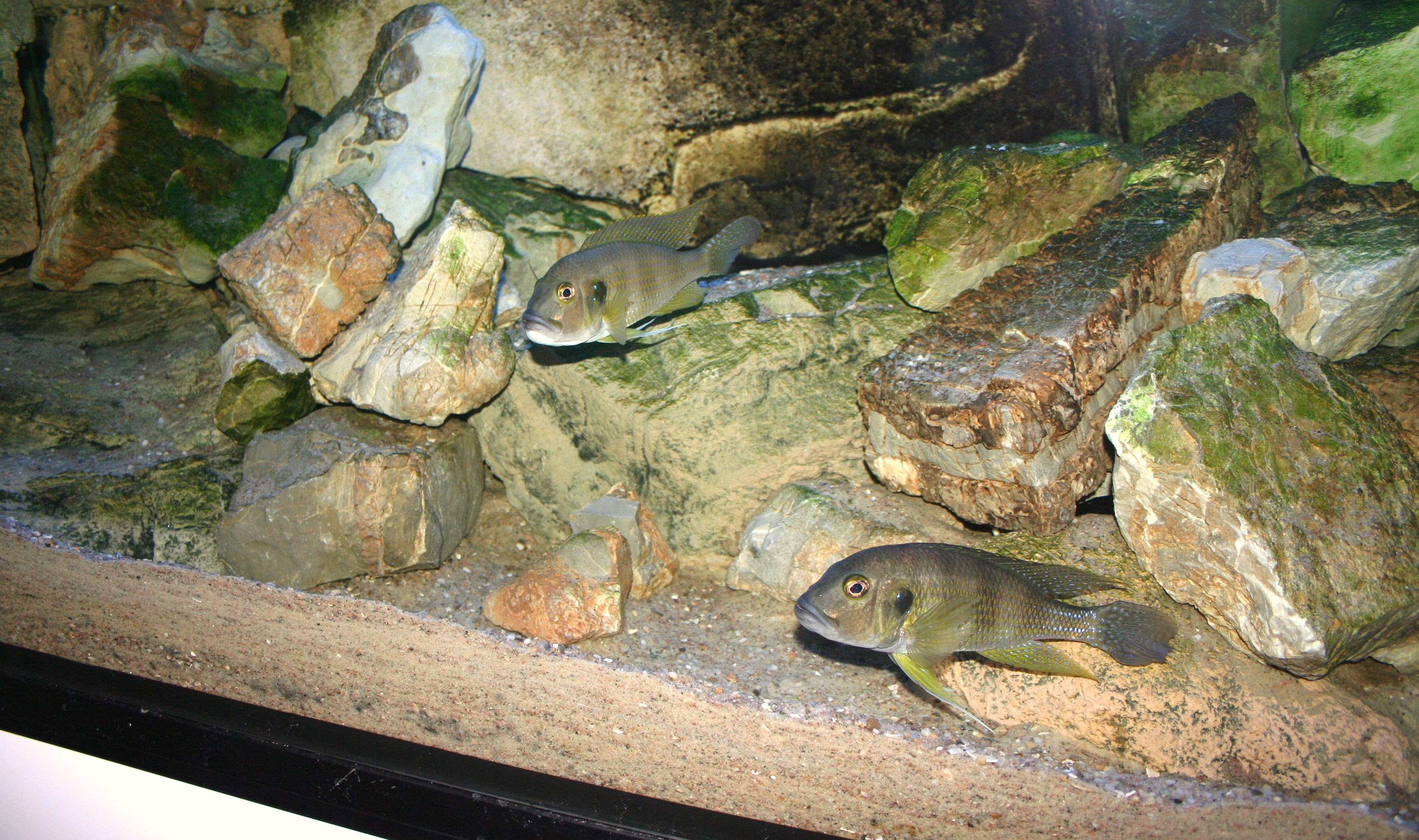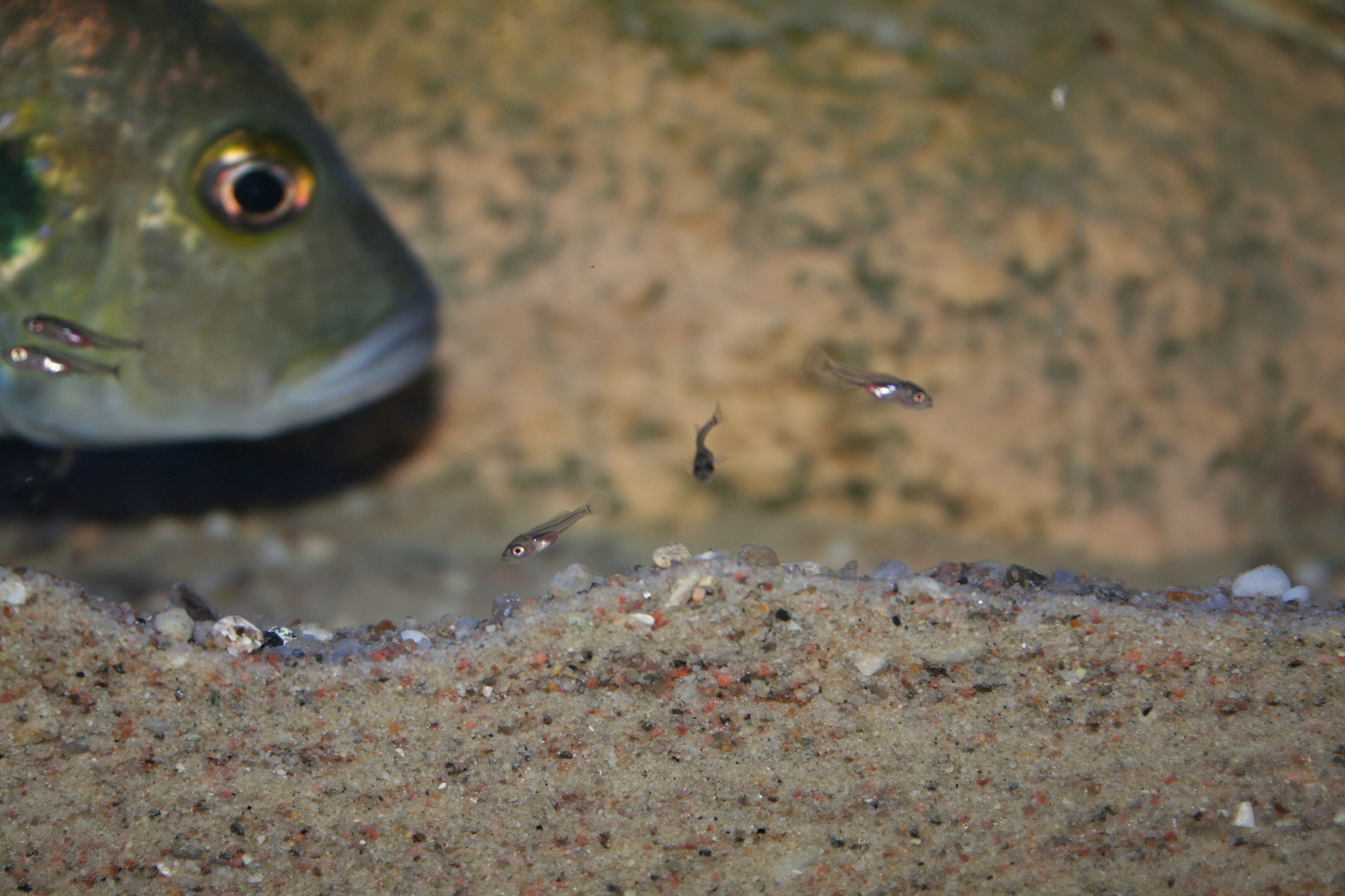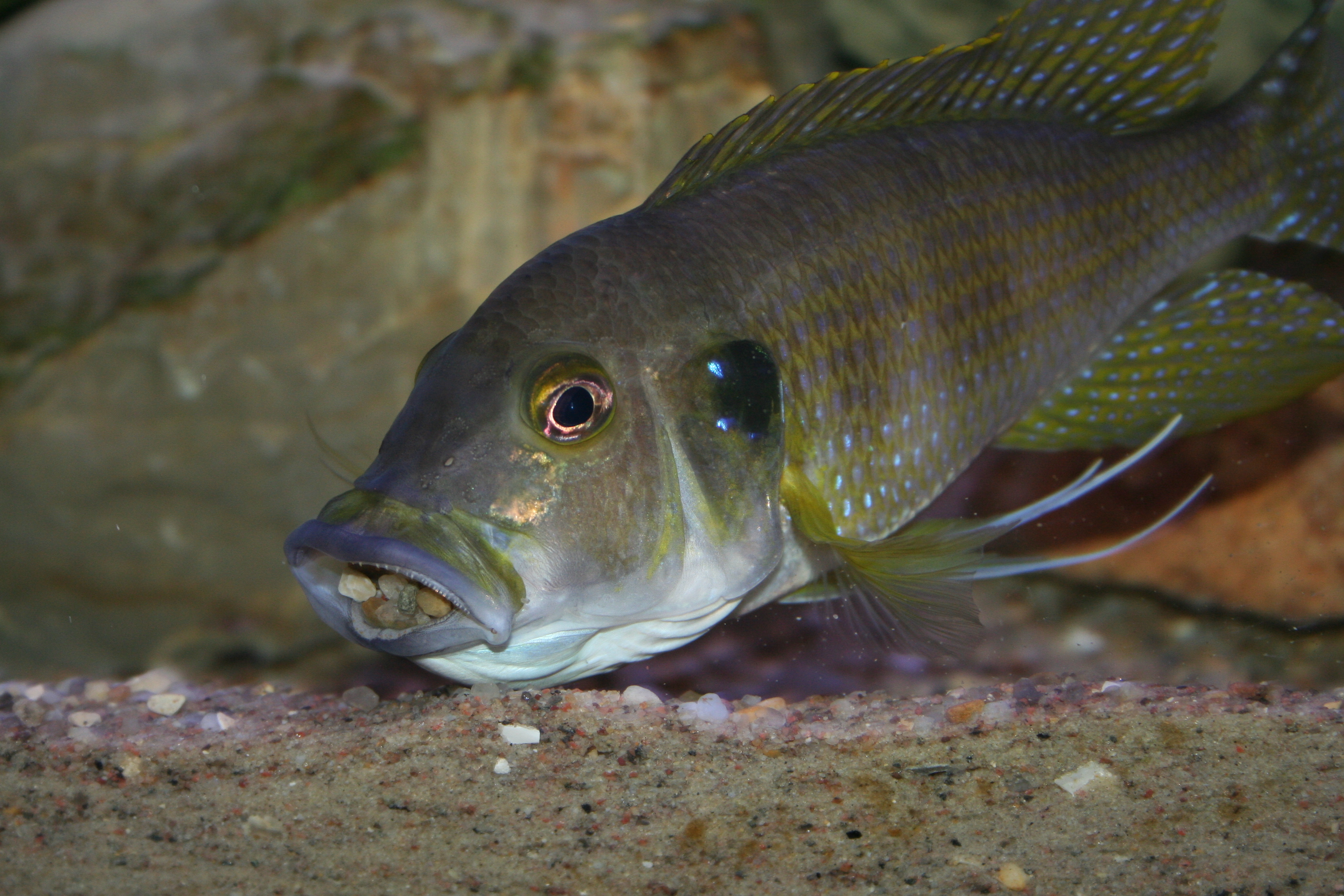 Ovenstående billede er taget om morgenen lige efter lyset tændes. Det er svært at forestille sig, at der lever mere end 200 fisk i dette akvarium. Efter 5 - 20 minutter kommer forældrene ud af hulerne med ungerne i munden. Når ungerne spyttes, går de direkte til bunden. Herefter spreder de sig stille og roligt ud over hele akvariet.