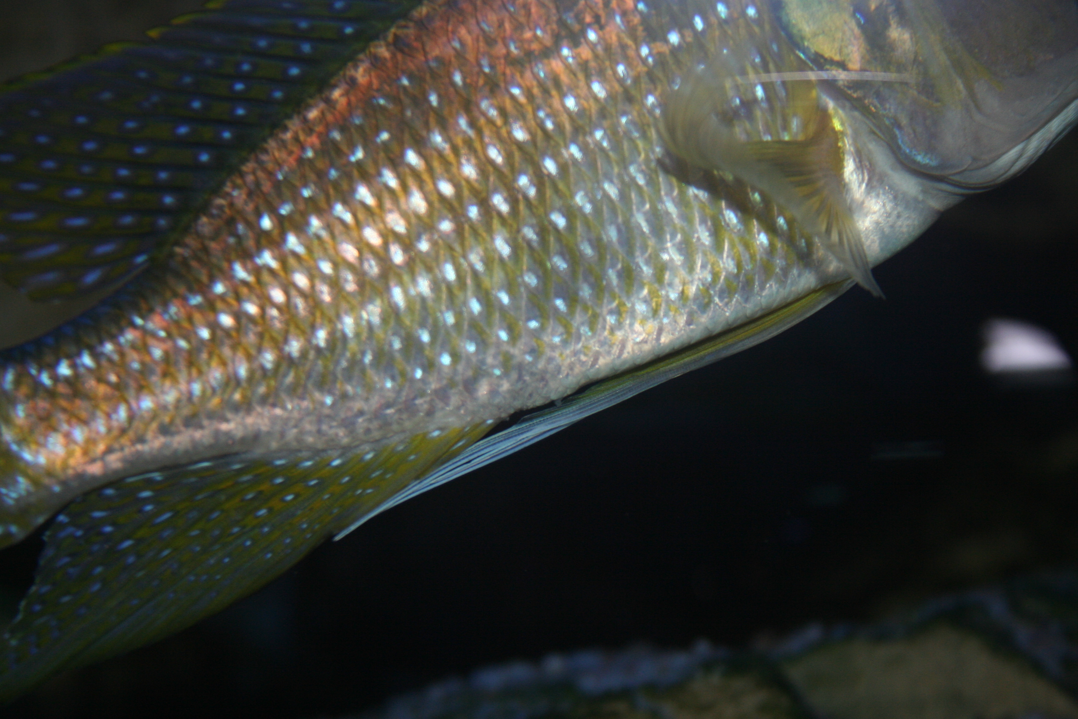 Begge forældre er konstant på udkig efter æg, som endnu ikke er blevet samlet op under overførslen, når der udveksles æg mellem forældrefiskene. Æggenes farve er cremehvid, og de er ca. 1 - 1 ¼ mm store, så vidt jeg kan se under de svage lysforhold.