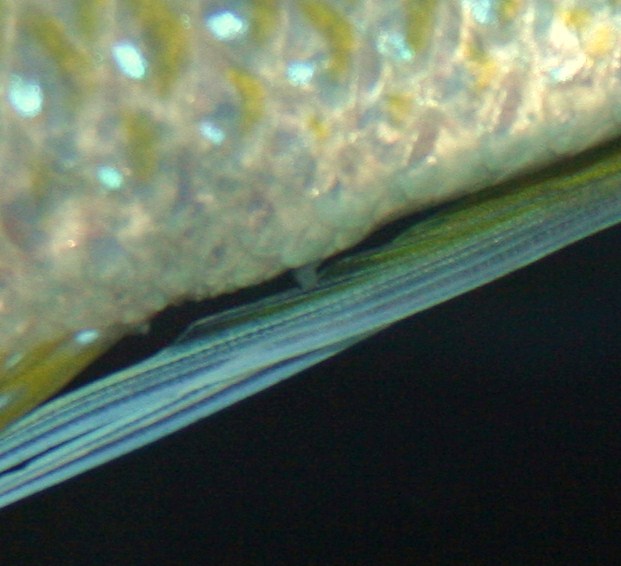 Hunnens læggerør er nu blevet synligt, selvom det er et meget lille rør kun ca. 2 mm stort.