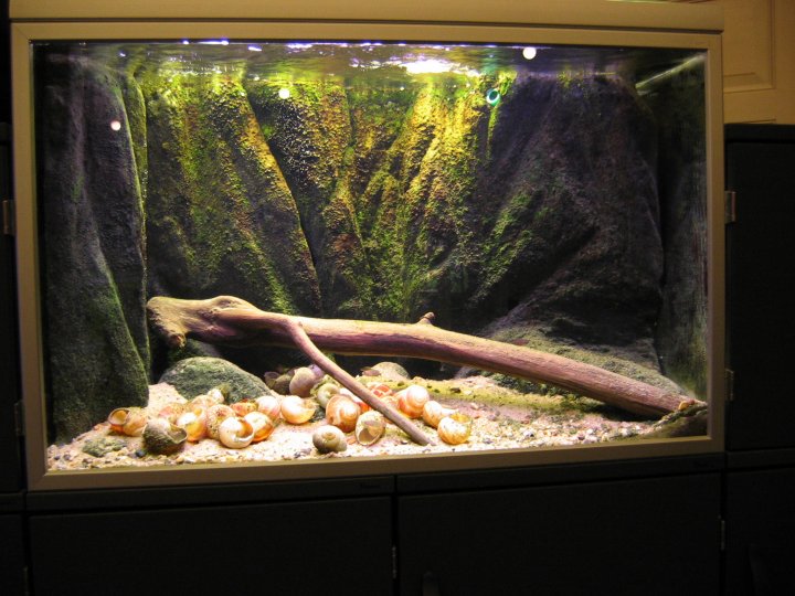 Hvad gør man så? Ja, disse oplevelser blev til et vendepunkt i min hobby! I desperation gik jeg til yderligheder, og lagde mit smukke, velfungerende planteakvarium om til en tanganyika-klippekyst!... Nogle vil måske kalde mig for "overløber" eller "forræder", og det krævede da også en del tilløb, at bevæge mig ind på et så nyt og ukendt område, men jeg blev lokket at de mange små og smukke klippekystcichlider; territoriale, pardannende, forholdsvis lette at opdrætte og samtidig mulighederne for en næsten naturidentisk indretning -lige som jeg ville have det!. Fuld blæs på motorfiltrene, ingen dyrebar CO2 at passe på og en maksimal iltning med et meget sundt akvariemiljø til følge. Frisk, ren bund uden smulder fra rødder og rådnende plantedele. Og hvor jeg før blot kunne have 1 eller 2 par dværgcichlider i et akvarie på 200 liter, kunne jeg nu have 4-5 forskellige arter med forskellig adfærd og en masse unger -hele tiden! Og jeg begyndte at sætte pris på de mange smukke alger(!) som snart dekorerede de i starten blændende hvide kalksten. Jeg tror jeg talte mere end 10 forskellige algearter på et tidspunkt; røde, brune, sorte, lysegrønne og mørkegrønne, langhårede og korthårede, men aldrig en eneste blå! Et ugentligt vandskifte på mindst 30% og rigtigt sunde fisk, som strålede af velbefindende.