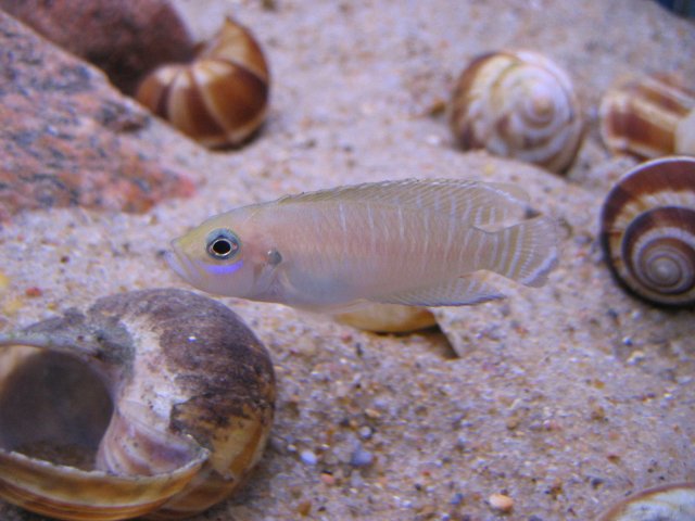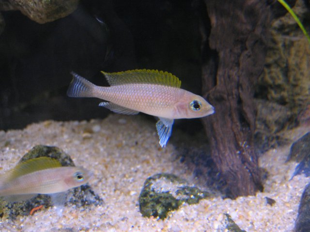Den populære knaldgule Neolamprologus longior (leleupi) tager altid kegler, når vi har gæster, og den producerer også en hel del yngel, som får den gule farve, når de når 2-3 cm. Det er nogle små frække fyre, som hurtigt færdes i hele akvariet og forsøger at stjæle æg og unger fra de andre arter.