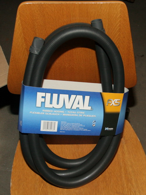 Her er slangen der følger med. Ca. 3 meter. Jeg er ikke ovenud begejstret da jeg ser slangen. For det første er slangen meget tyk, og for det andet er den ikke gennemsigtig. Du kan dermed ikke se hvis der sidder en masse skidt et sted. Men jeg hæfter mig mest ved at der kun er 3 meter. Det vil betyde at jeg ikke kan placere pumpen hvor jeg vil da akvariet er 2 meter langt, hvilket er en typisk størrelse akvarium til dette filter. Da akvariet er 75 cm. højt, så er der kun lige slange nok til at slangen kan komme over kanten når jeg stiller spandfiltret i den ene side.