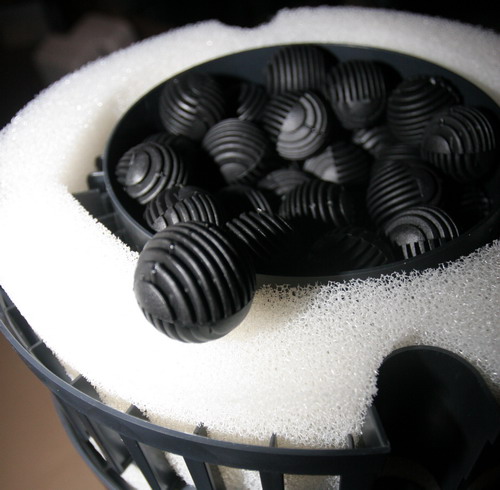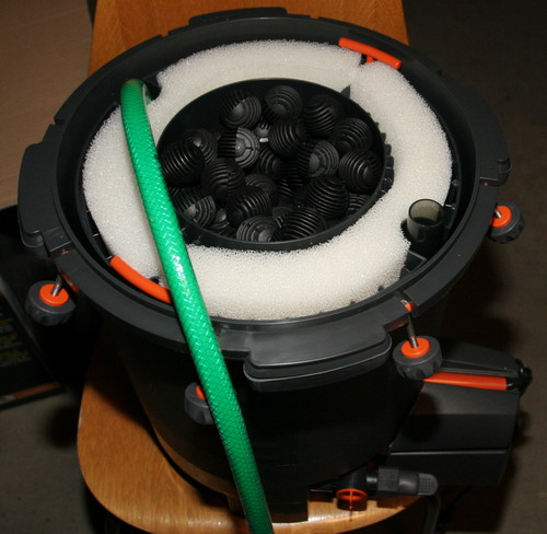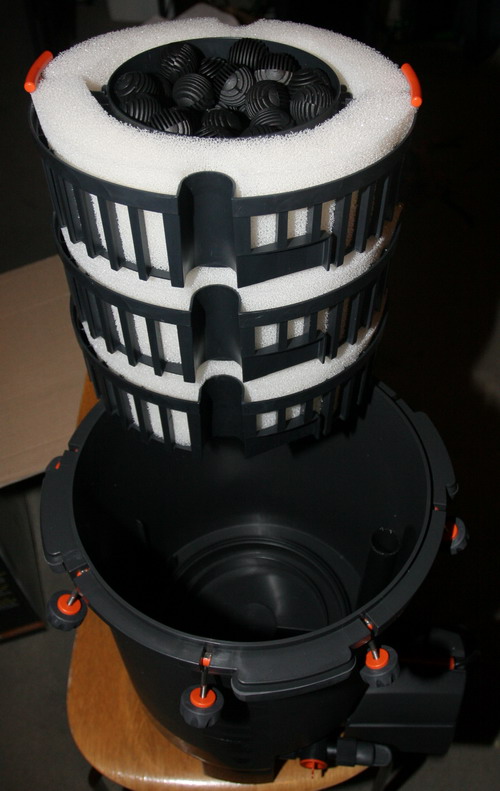 Der er 3 kurve, og dem vælger jeg at fylde med mit yndlingsfiltermateriale Bactoballs (nogle kalder dem bioballs). Mine eheim spandfiltre efterses kun hvert 1½-2 år med denne kombination. Der kunne være ca. 4½ liter bactoballs. Ergo er det ikke et filter der sluger den helt store mængde trods sin ellers store størrelse. 5 Liter Bactoballs koster pt. ca. 120,- hos http://www.cichlidecentret.biz/