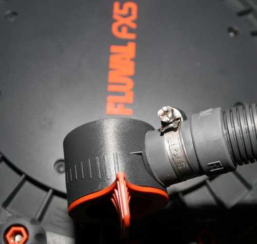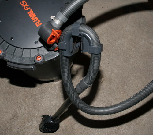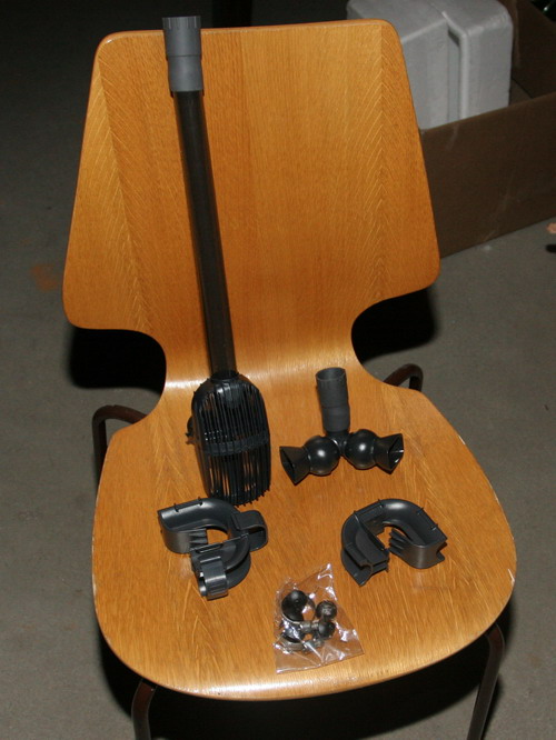 Indsugningsrøret fra Fluval ligner en gammeldags mikrofon! Men den store indsugning stopper næppe lige til af blade. Udblæseren har to hoveder, og hvert hoved kan justeres i alle retninger. Dette er ret smart! Så kan du fx placerer udblæseren midt i akvariet og den kan blæde i begge retninger. Så er man bedre sikret et fint flow i begge ender. Der er 2 sammenbøjninger med. Således kan man holde flexslangen på plads. Dertil er der spændebånd med.