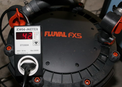 Fluval FX5 har jeg målt til 42W i timen hvilket koster ca. 550,- pr. år.