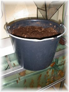 Om man inte vill eller kan lägga ut de 2000-3000 kr en reverse osmos kostar finns det en annan metod, som fungerar minst lika bra och man får även vattnet ned surat.Det enda man behöver är en större hink på 15-25 liter (se bild ) som man har borrat ett hål i botten på. Man lägger sedan ett lager med filtervadd som man har till luftdrivna pumpar i botten på hinken. Lagret skall vara runt 5 cm tjockt. Sedan fyller man upp med torv, som man köpt på en vanlig trädgårdshandel. Kontrollera så att du inte köper en torvsort som innehåller någon slag av gödsel. Packa torven och häll på lite vatten, packa igen. Innan man använder hinken brukar jag hälla på en hink med varmt vatten, så att man får bort en del skit som hänger med i början. Sedan ställer man hinken på ett par brädor, som ligger på en tunna eller nått tomt akvarium. Om det är ett par hundra liter man skall filtrera blir det ganska jobbigt att fylla på med en hink. I stället har jag fyllt på hinken med en vattenslang. Det finns dock en nackdel med detta och det är att man inte filtrerar över all torv pga vattnet rinner ner där slangen ligger. Det är även svårt att ställa in vattenflödet, så att det står ett par cm i hinken, men fyller man på via en vattenkanna och får vattnet mer utspritt får man ett klart bättre resultat. Mitt kranvatten ligger på 7-8 i ph beroende på vilken årstid det är men efter att kört det genom hinken ligger det runt 4-5 ph. Låt sedan vattnet stå ett dygn så att ph stabiliserar sig, samt sätt dit ett par syrestenar som skapar cirkulation i tunnan.
