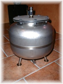 På bilden kan ni se en så kallad torv bomb och det är en vidare utveckling av hinken. Genom att använda mina kunskaper från mitt jobb ritade jag fram denna rostfria burk. Det är i princip en vanlig tät behållare med en ingång samt utgång.I övre änden på burken har jag svetsat på en fläns med lock, detta för att lätt kunna byta ut torven. I locket samt i botten på burken har jag svetsat fast ett par muffar, där har jag också monterat ett par kranar samt ett par snabbkopplingar för inkommande och utkommande vatten. I botten på burken har jag lagt flera lager med filterplattor, detta för att torven inte skall kunna rinna ut. Sedan har jag fyllt upp burken med torv samt placerat ytterligare några lager med filterplattor, detta för att det utgående vattnet skall vara så rent som möjligt. Sedan kopplar man på vattnet under burken och styr det inkommande vattenflödet med kranen. I huvud sak är det torvens kvallite som styr vattnet egenskaper, som ph och hårdhet (GH) , men genom att ändra på genomflödet i burken kan man styra detta till viss del. Det fina med denna konstruktionen är att när vattnet stiger under ifrån och upp filtreras vattnet via all torv i burken, samt att du själv kan styra filtrerings hastigheten. Även om man filtrerar över fullt tryck får man ett förvånands värt bra resultat. Har jag ett ph värde på 7-8 innan filtreringen,hamnar det sedan på 4-5 i ph. Blanda sedan ut vattnet med vanligt kranvatten eller osmos vatten till önskvärt ph och (GH).Låt det sedan stå ett dygn, detta för att ph skall stabilisera sig.Denna ide fick jag efter ett besök hos Johan Nilsson i Jönköping när han visade en film hur man odlade på vildfångad fisk och använde en liknande konstruktion.