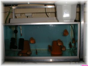Men som jag nämnt tidigare så behöver man inte göra speciellt mycket med sitt vatten för att få ett bra resultat. All beredning kräver ju sin tid samt att man måste ha plats för allt vatten. Efter att tröttnat att hålla på och svabba med allt vatten i tunnor har jag gjort en enkel lösning, detta genom att placera 5 liters krukor med torv ovanpå karen. Dessa är gjorda precis som hinken och har samma funktion. I stället för att stoppa vattenbytes slangarna direkt i karet, så går vattnet genom krukan först och sedan ner i karet.Torven byter jag ut vid jämna mellan- rum när den har tappat sin effekt. Jag använder torvvattnet mest till att stimulera fisken till lek samt när paren går med yngel. Bakterier trivs sämre i ett surare vatten samt att vissa ämnen som amoniak inte är lika farligt vid ett lågt ph. Genom att använda vattenbytet , vänjs fisken sakta med det nya torvvattnet. Skall man använda torvvatten är det viktigt att vänja in dom sakta för att undvika en chock och kanske dödsfall. Nu mera om jag använder min reverse osmos låter jag även detta vatten gå via krukan som står ovanpå karet .På bild 4 ser ni en av mina krukor samt en ny inköpt diskus grupp av Red Spotted.