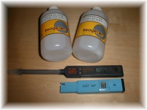 Om man nu vill ta reda på vad man har för slags vatten i sina kranar eller i sitt akvarium, finns det hur mycket grejor som helst att köpa. På bilden ser ni två digitala mätare,en är för att mäta ph och den andra för att mäta micro siemens.Skall man använda dessa mätare måste de kalibreras med jämna mellan rum för att få ett rättvist resultat.När de väl är kalibrerade visar de ett mycket noggrant resultat.En ph mätare kontrolleras med hjälp av två olika vätskor(se bild), som har olika kända ph-värden. Dessa vätskor har en noggrannhet av 0,01.Mickro siemens mätaren kalibreras även den i en vätska som har en känt ledningstal. Har man inte till gång till såna här mätare finns det massor av olika vätskor, som man kan prova med. Dessa hittar ni i de flesta akvarieaffärer.En ph test visar i vilken grad vattnet är surt eller alkaliskt. Vill man ha ett surare vatten gör man lättast som jag nämnt förut och använder torv. Men vill man däremot ha ett mindre surt vatten kan man till sätta bikarbonat, kalk eller använda det vanliga kranvattnet för att få det värde man vill ha. När man använder hinken eller torvbomben får man alltid ett surare värde i början (runt 4-5) och man behöver därmed blanda ut det mer. Men efter ett tag så sjunker effekten på torven och man behöver inte späda ut vattnet så mycket .Jag brukar blanda ut det så det ligger runt 6.0-6.8 ph.