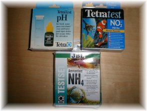 Genom att mäta de olika nedbrytnings stadierna, som är från amonium till nitrit och till sist nitrat kan man göra sig en bild av hur bra ditt akvarie system fungerar. Har man ett värde som är högre än vad de rekommenderar i testerna har man en störning i filtren. Odlar man diskus och håller på att dra upp en större mängd yngel är det svårt att få ett fungerande biologskt system,detta pga all matning som görs. I ett sådant här fall löser man det lättast med massiva vattenbyten. Använder man oxhjärte-mixen skitar man ner rejält och det är ytterst viktigt att suga upp den mat som inte har ätits upp. En annan test som är bra att göra är ett hårdhets test av vattnet och det delas upp i olika hårdhetsgrader. Desto lägre (GH) du har desto mjukare är vattnet. Ett mjukt vatten får man genom att filtera bort de lösta salterna mineralerna ur vattnet och det görs på följande sätt som jag nämnt ovan. Vill man däremot ha ett hårdare vatten kan man till sätta en blandning av 15ml kalciumsulfat och 15 ml magnesiumsulfat samt 30 ml havssalt i en liter jummet osmos vatten. Skaka sedan flaskan väl och tillsätt sedan detta till ditt akvarievatten eller osmos vatten så att du får en lämplig microsiemens för det ända mål du skall ha det till.Till lekparen kan man ligga på runt 50-120 ms men när ynglen har blivit lite större är det bättre att höja ms talet och då är vanligt kran vatten som ligger runt 200 ms bra. På bilden ser ni provnings-vätskor för ph .amonium.nitrit.