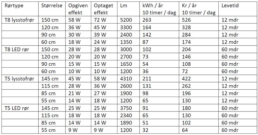 Bemærk at levetiden ved LED belysning er 5 gange længere end for lysstofrør. Et LED rør kan altså koste 5 gange så meget som et lysstofrør og stadig ikke være dyrere pr år end et lysstofrør.