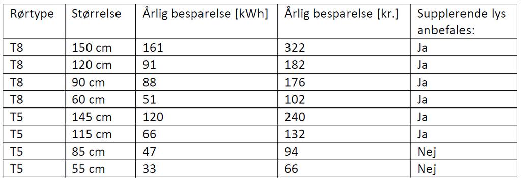 Den årlige besparelse ved skifte fra lysstofrør til LED er som følger (ved LED rør som koster præcis 5 gange så meget som lysstofrør i samme størrelse og skifte 1 til 1):